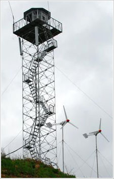 瞭望塔(了望塔)結(jié)構(gòu)一般為鋼結(jié)構(gòu)塔架,拆、裝方便。平面為四邊形自立式或拉線(xiàn)式,主體曲線(xiàn)一般為折線(xiàn)型,內(nèi)部結(jié)構(gòu)為交叉式,上部設(shè)工作平臺(tái)或值勤房,內(nèi)部設(shè)有斜向爬梯或旋轉(zhuǎn)爬梯。
